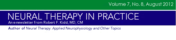 Dear Colleagues: This month I plan to discuss the subject "safety in neural therapy". This is not a topic that comes up often in neural therapy discussions, perhaps because in comparison to most mainstream medical treatments, it is so much safer. I would guess that one of the great satisfactions for most physicians practicing neural therapy is seeing patients give up their anti‐inflammatory medications, their anti‐depressants, their anti-convulsants, etc. However, neural therapy is considered an "alternative" treatment in most medical jurisdictions and because of this, (oddly enough) standards of safety must be much higher than for mainstream medicine. What makes this odd is that the medical regulatory authorities seem to be almost blind to the hazards of medicine to which they expect physicians to conform, yet portray "alternative" medicines as being dangerous. Much of this attitude is fueled by ignorance and fear: ignorance of the practices that they proscribe, and fear that these alternatives might expose the inadequacies of the practices that they support. This situation has come to a head recently in the jurisdiction where I practice (Ontario, Canada). A new policy on Complementary Medicine is requiring physicians to spend much of their time warning patients of the risks of the services that they provide, and of course documenting everything. This is annoying to both patients and the physicians they consult. It is also condescending. Patients generally consult physicians practicing outside the mainstream for their own reasons and in my experience they are already well informed ‐ certainly better informed than many mainstream physicians. Nevertheless raising the question of risks in "alternative" medicine has its value. Risks, although few, do exist. This is true of neural therapy as with any other intervention in human physiology. However when researching the dangers of neural therapy, I could find nothing about risk in the peer‐reviewed English literature. The Manual of neural therapy according to Huneke by Peter and Matthias Dosch (translated from German) appears to be the only resource for English readers. I particularly value the Doschs' writing on this topic, not only for their vast experience in neural therapy, but also for their contact with the great pioneers of neural therapy, including the Huneke brothers. If any complications of neural therapy occurred in those exploratory years, they would have heard about them. The risks of neural therapy fall into two main categories: